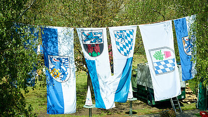 Fahnen und königliche Wappen vor dem Eingang zur evangelischen Kirche unterstreichen den festlichen Anlass: Die Dörfer der ehemaligen Grafschaft feiern einen denkwürdigen Tag: den 725. Jahrestag der Verleihung der Stadtrechte an Veldenz.